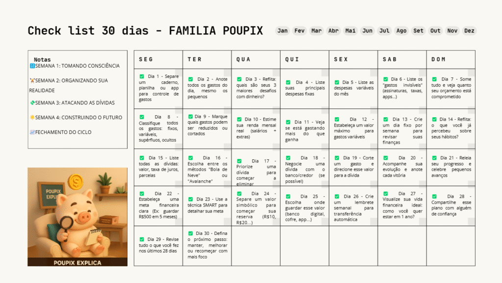 O conteúdo é direto, leve e pensado pra quem nunca estudou finanças. Você vai aprender no seu ritmo, com exemplos reais, linguagem simples e ferramentas que cabem na sua rotina